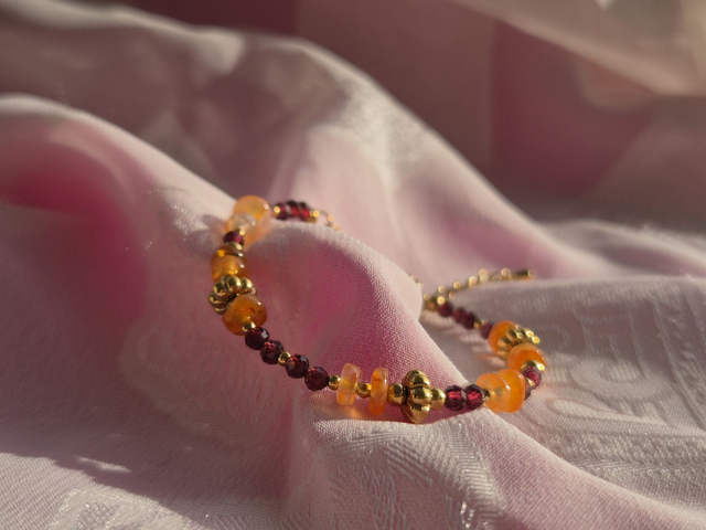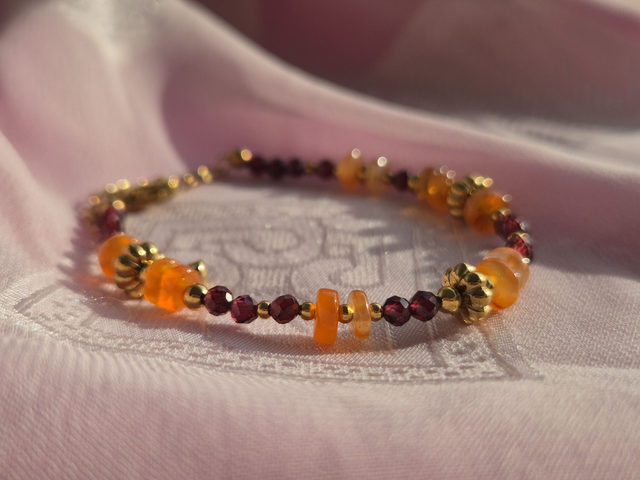 Confectionné à la main dans notre atelier, Hazel marie avec finesse les éclats profonds du grenat et les reflets orangés de la cornaline. Ensemble, ces pierres fines évoquent les teintes dorées des feuilles d’automne et insufflent une énergie chaleureuse à votre quotidien.
