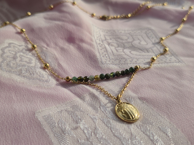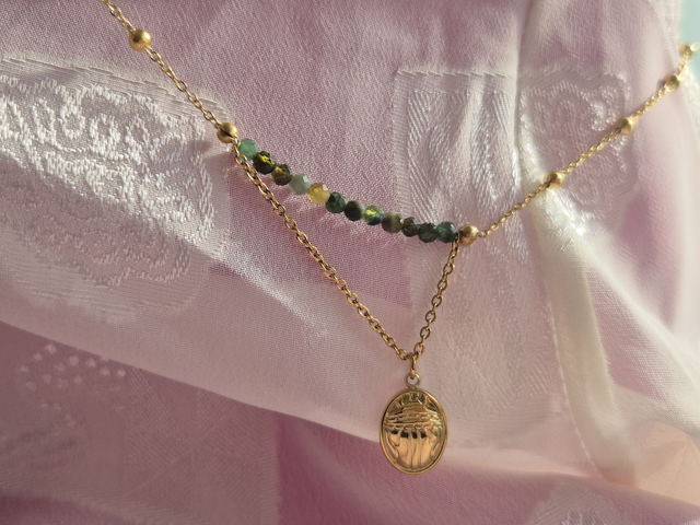Auréliane se révèle dans une délicatesse aérienne : une chaîne fine ornée de perles de tourmaline verte, dont les éclats apaisants évoquent la sérénité des jardins baignés de lumière.