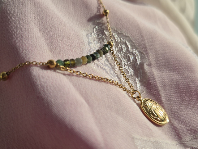 Au centre, le scarabée se déploie en pendentif discret, messager de renaissance et gardien des âmes, offrant une touche d’originalité subtile et protectrice.